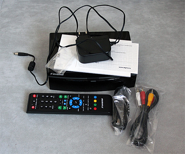 В комплекте: устройство, адаптер питания, USB-кабель, AV-кабель, пульт управления, инструкции.