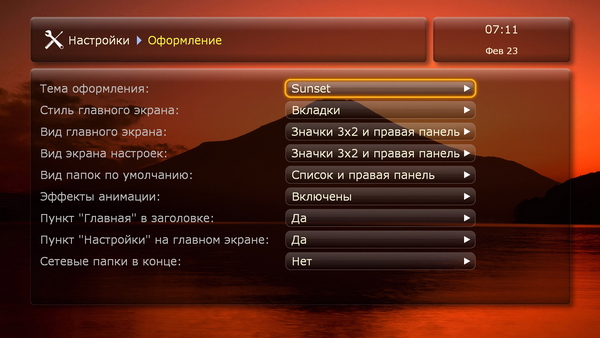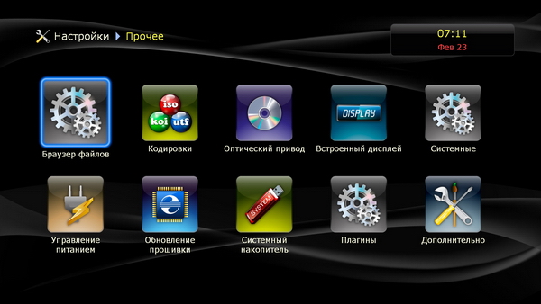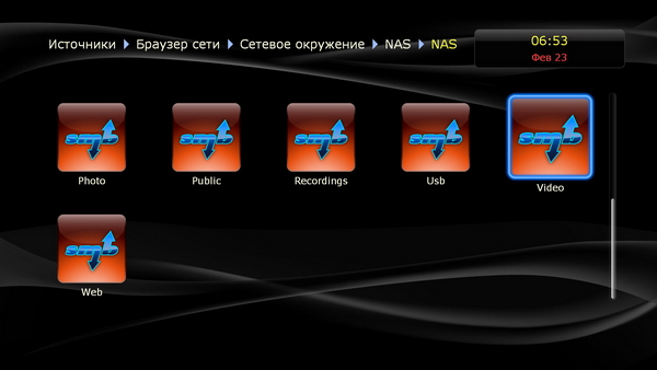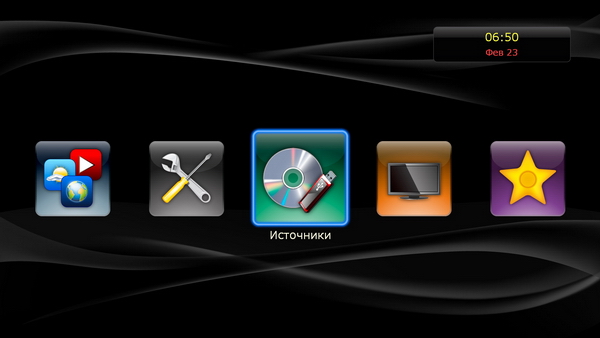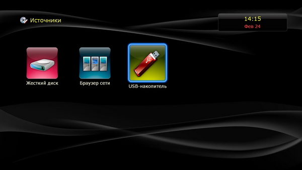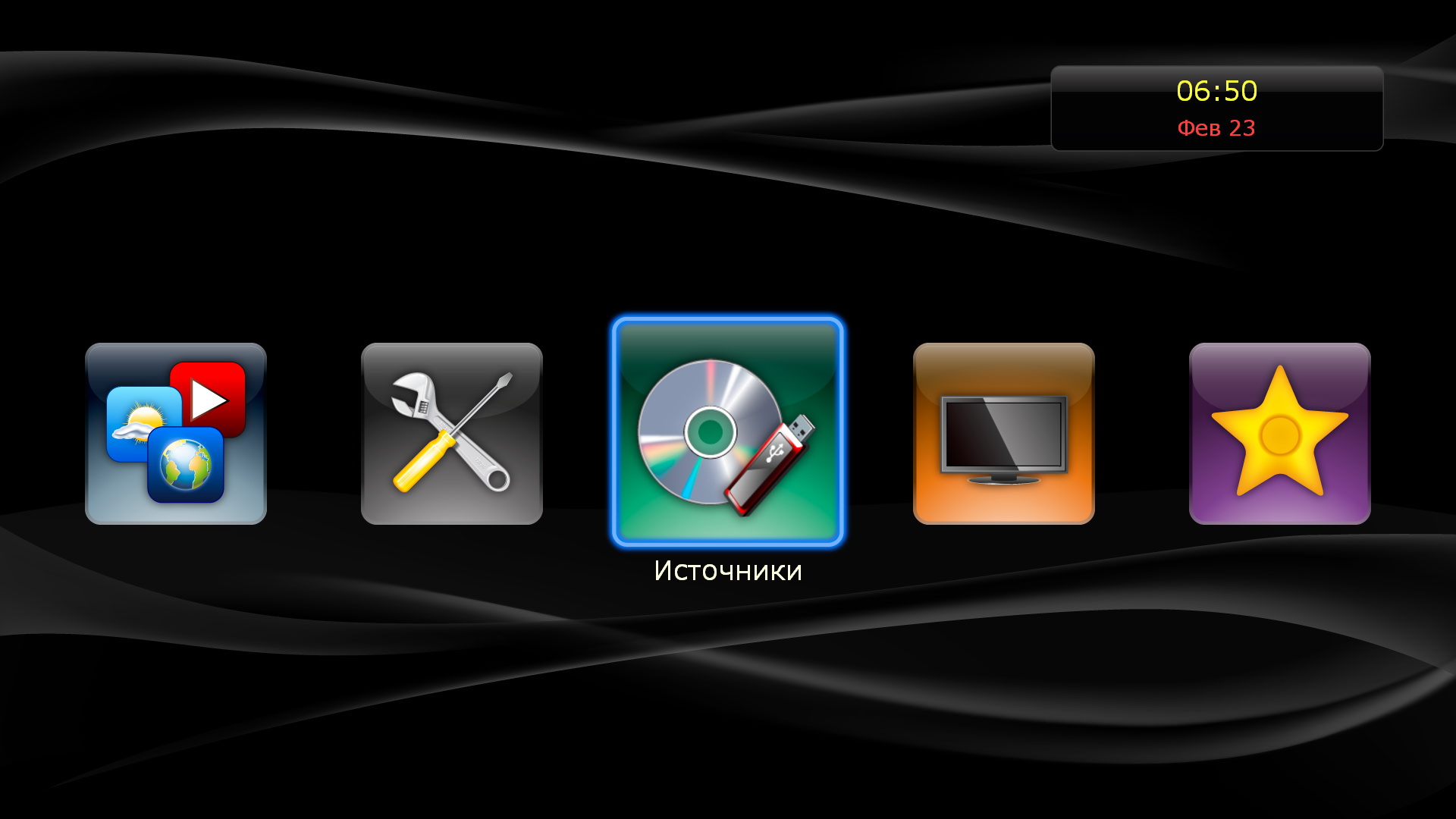Заходим в раздел "Источники". Медиаплеер умеет работать с установленным жестким диском, подключенными по USB устройствами (флешки, внешние диски, DAS и так далее), SAMBA-серверами (серверами сети под Windows) и UPnP-устройствами.