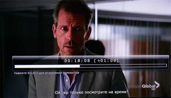 Во время воспроизведения доступны следующие виды перемещения по временным меткам: курсор вправо - прыжок вперед на 10 секунд, курсор вверх (кнопка ускорения) - вперед на 1 минуту, кнопка навигации по главам - вперед на 10 минут. Аналогично можно перемещаться в обратную сторону курсорами, кнопками ускорения и навигации по главам.