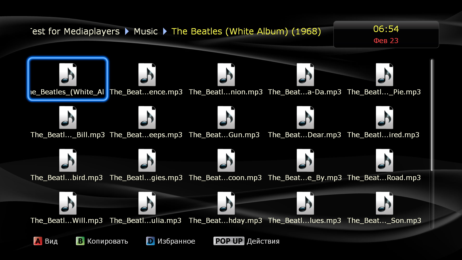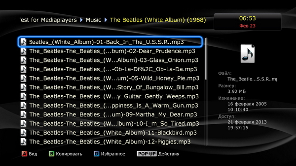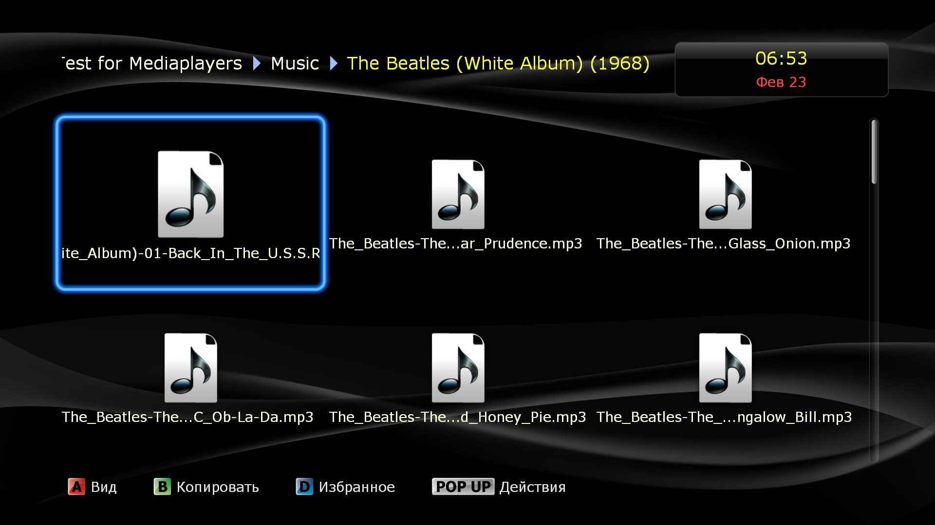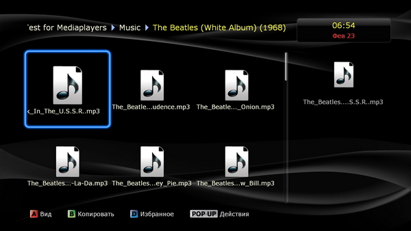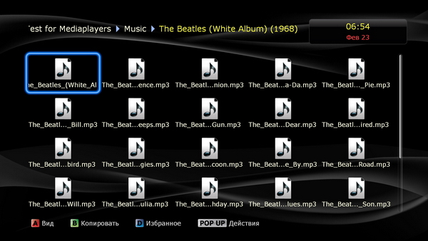 Проверяем воспроизведение музыки. Заходим в папку с альбомом. С помощью красной клавиши "А" можно менять вид списка композиций (точно так же меняется представление любых медиаданных).