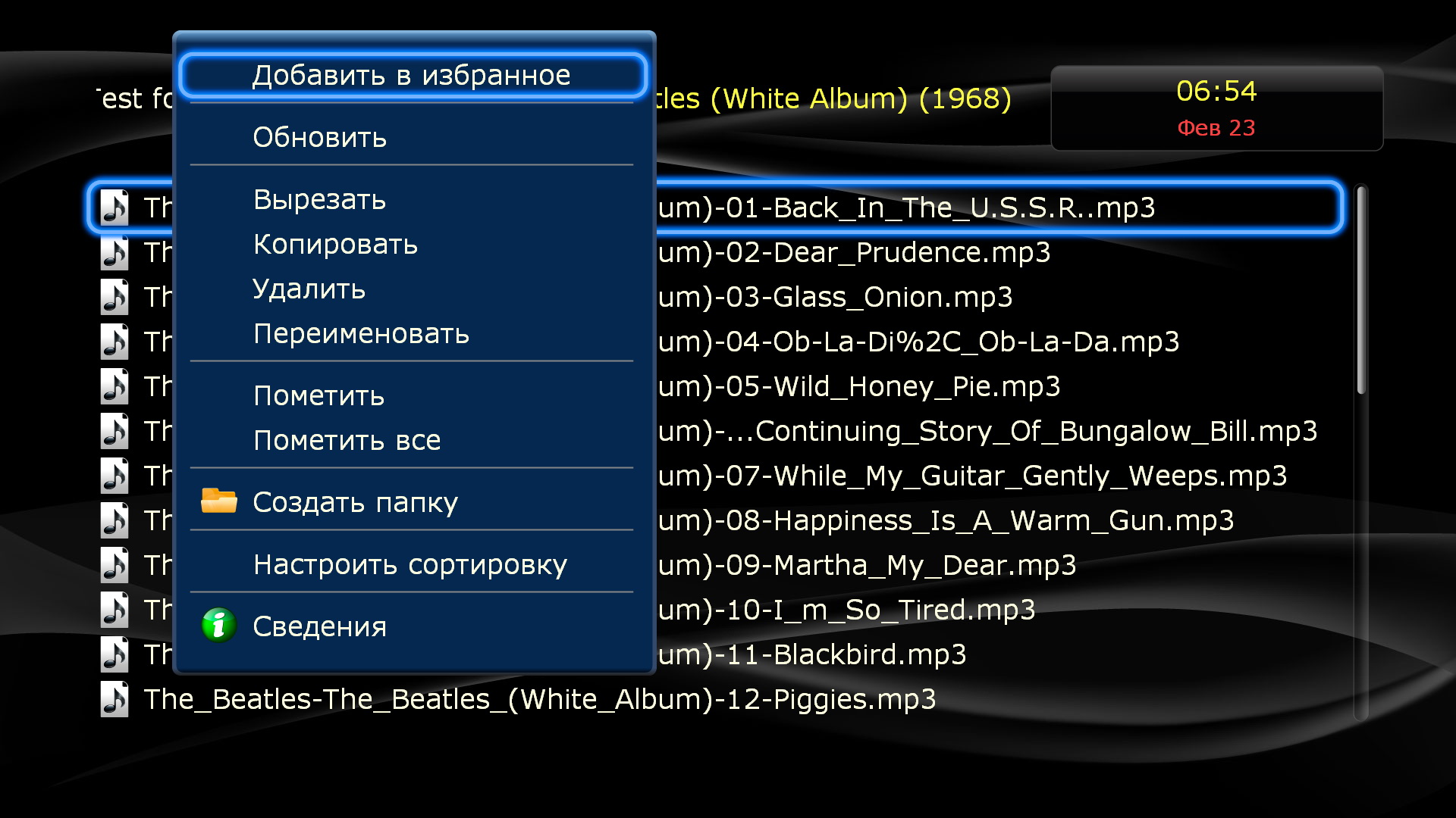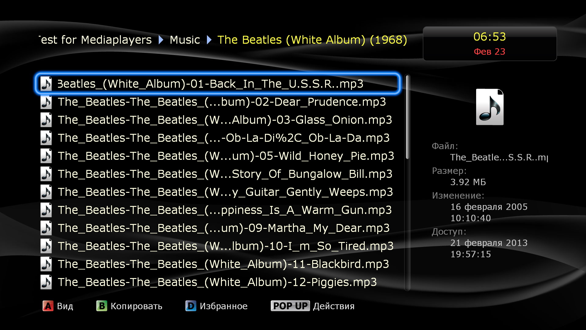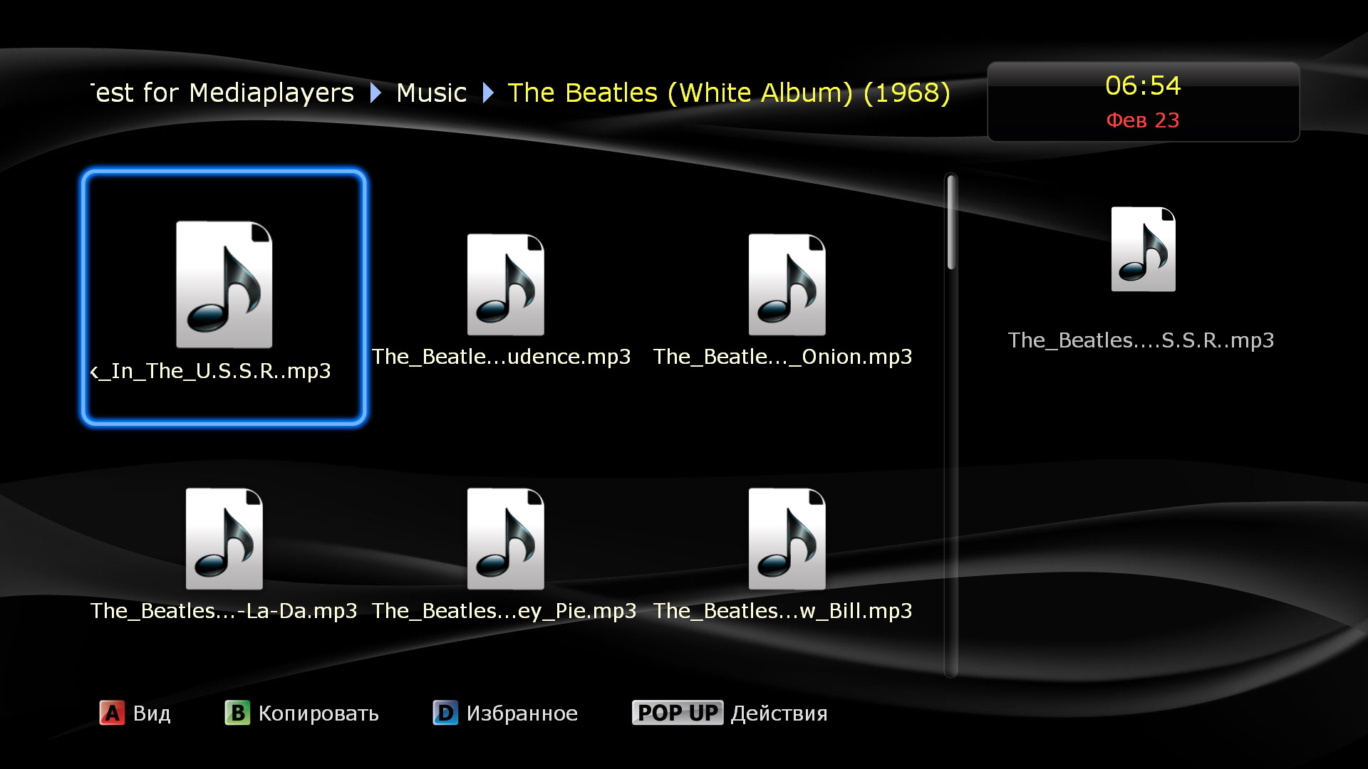 Проверяем воспроизведение музыки. Заходим в папку с альбомом. С помощью красной клавиши "А" можно менять вид списка композиций (точно так же меняется представление любых медиаданных).