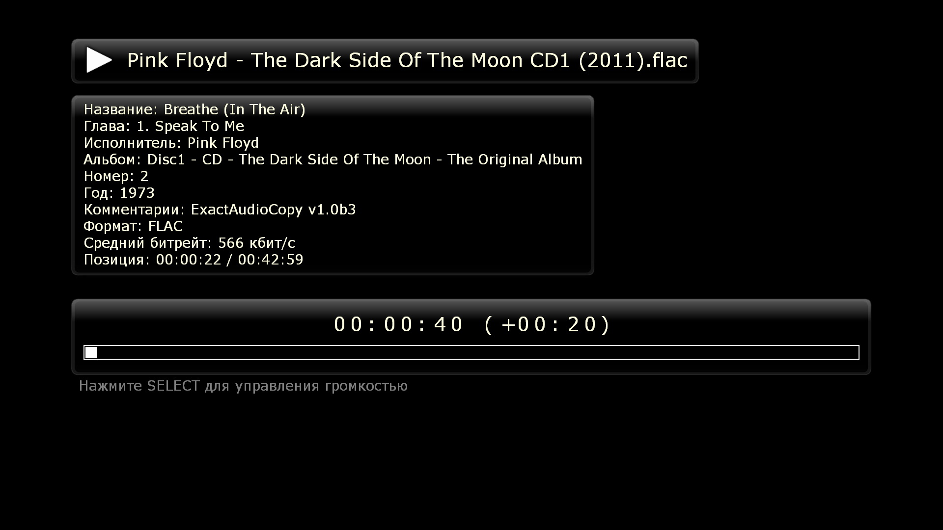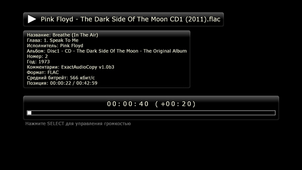 При воспроизведении нас не балуют видами красивого плеера. На экран в сухом черно-белом варианте выводятся всякие данные проигрываемого трека. Впрочем, нам же слушать, а не смотреть, так что не страшно. Хотя вид какого-нибудь симпатичного плеера не помешал бы.