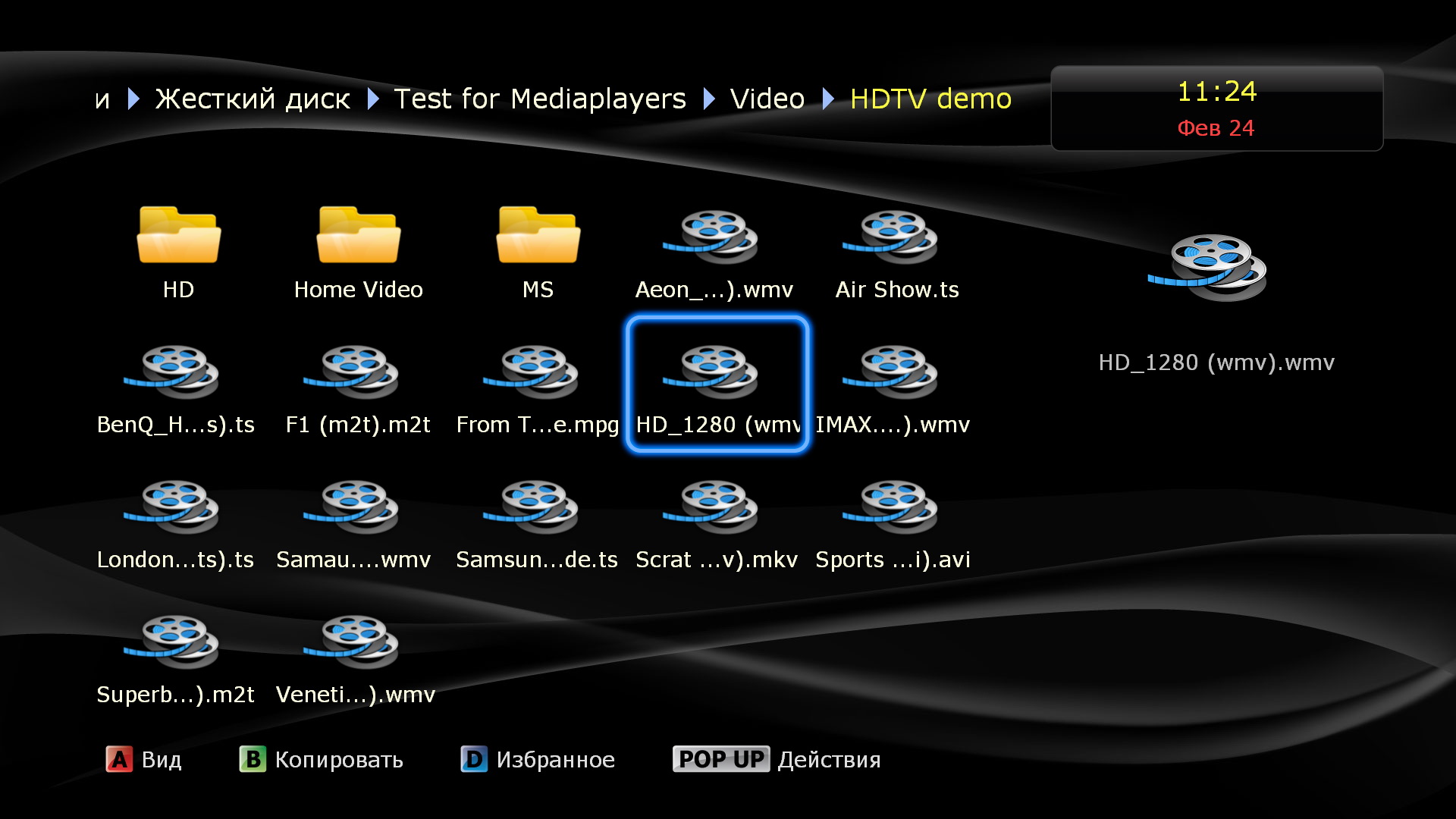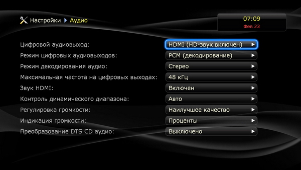 Аудиоформаты - AC3 (Dolby Digital), EAC3 (Dolby Digital Plus), Dolby True HD, DTS/DTS-WAV, DTS HD, DTS HD Master Audio, LPCM (Multichannel), MPEG/MP3/MPA, AAC (Multichannel), WMA/WMAPro, APE (Multichannel), FLAC (Multichannel), WAV Pack (WV), ALAC (Apple Lossless), Ogg/Vorbis