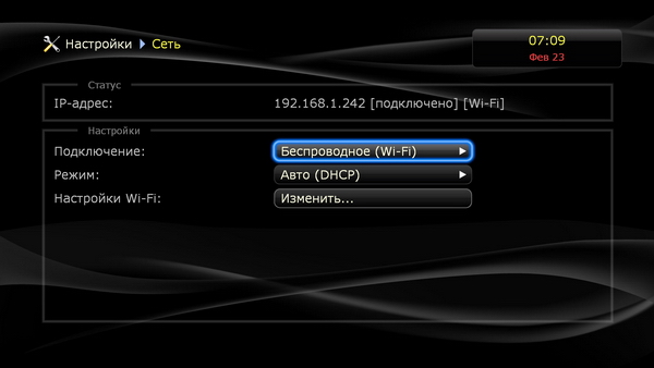 Сетевые настройки. Если задать Ethernet-подключение, то появится еще один пункт - "Точка доступа Wi-Fi". При этом медиаплеер можно превратить в самостоятельную точку доступа, через которую другие устройства будут получать доступ в Сеть. Это все нормально работает, я проверял.