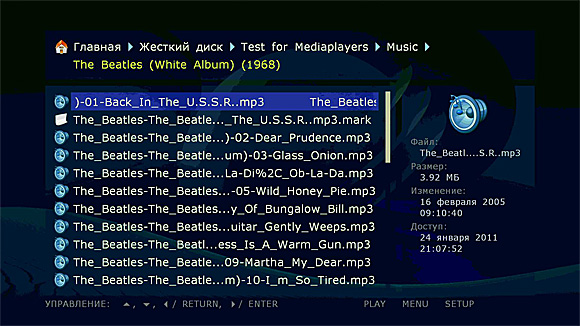 Тоже все скромненько. Список треков, в котором доступны файловые операции и сортировка по названию, размеру, доступу, изменению. Никакой тебе специальной музыкальной сортировки: по альбому, исполнителю, году выпуска и так далее.