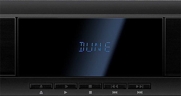 На передней панели в центре - однострочный дисплей со светящимися голубыми символами, под дисплеем - простенькие кнопки управления воспроизведением. Кстати, запустить диск этими кнопками не получится, они только для управления на лету - остановить, поставить на паузу, запустить снова, перескочить на следующий трек или раздел. Ну, мало ли, вдруг вы валяетесь рядом с медиаплеером, у вас нет сил дойти до пульта, но есть силы ткнуть в плеер.