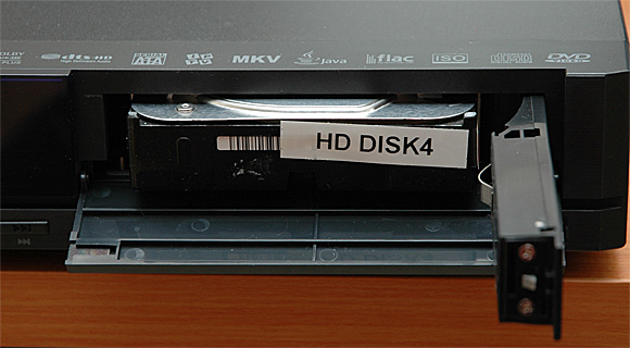 Справа - одна из главных особенностей этого медиаплеера: специальный отсек для "горячей" установки 3,5-дюймового жесткого диска с интерфейсом SATA. Отсек сделан очень удобно: открываете крышку, открываете панельку, вставляете диск, закрываете панельку и крышку - все, диск установлен. "Горячей" эта установка называется потому, что диск можно ставить при включенном плеере - он после закрытия панельки будет опознан системой.