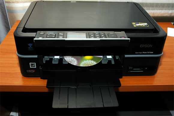 С печатью на компактах здесь решение просто замечательное. В обычных Epson Stylus, которые у меня были, печать на CD/DVD делалась с помощью специальных пластиковых лотков, куда помещалась болванка, а потом все это вставлялось в специальные направляющие. При этом, во-первых, требовалось определенное место позади принтера, откуда этот лоток выезжал во время печати, во-вторых, требовалось на глаз совмещать лоток со специальными направляющими, а в-третьих, стоило только лоток поставить чуть криво (а там был заметный люфт) - принтер отказывался печатать и сообщал, что лоток вставлен неправильно.