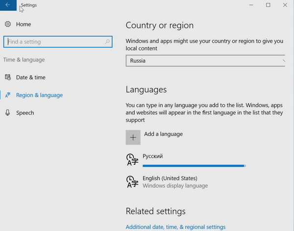 Но его легко переключить на русский: нужно зайти в настройки региона и языка (Region & Language), добавить русский язык в языки интерфейса (компьютер скачает языковый пакет), после чего переключиться на русский.