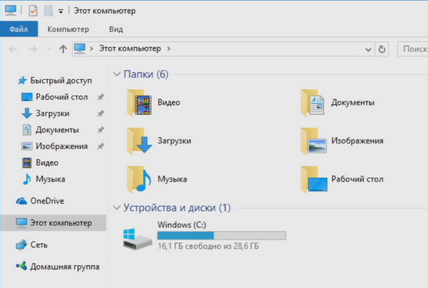 Окно "Этот компьютер". На флеш-памяти свободно 28,6 ГБ. Но память можно расширить еще на 128 ГБ с помощью карты microSD. Полученных 156 гигабайт вполне хватит под обычные задачи. (Это уж не говоря о том, что сюда можно подключать внешние жесткие диски хоть на 4 ТБ.)