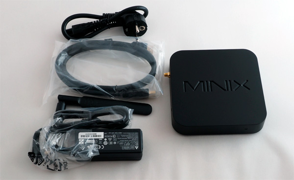 Комплектация следующая: устройство, отвинчивающаяся антенна, адаптер питания с сетевым кабелем, HDMI-кабель. Никакого пульта управления не предусмотрено, но это компьютер, а не медиаплеер.