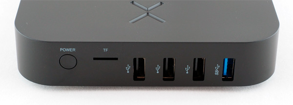 На правом торце: кнопка включения, слот для карты памяти microSD, три порта USB 2.0 и один скоростной порт USB 3.0.