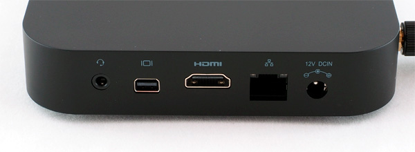 На заднем торце: аудиовыход, мини-Display Port, HDMI, сетевой порт Ethernet (гигабитный), вход адаптера питания.