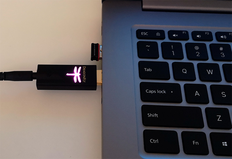 Стрекоза на корпусе - это индикатор, показывающий частоту дискретизации, что очень даже полезно: 44,1 кГц - зеленый, 48 кГц - синий, 88,2 кГц - янтарный и 96 кГц - фиолетовый. Более высокие частоты дискретизации он также может принимать, но они будут понижаться до максимальной для данного устройства частоты 96 кГц.