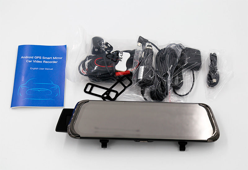 Комплект поставки: зеркало-видеорегистратор, кабель питания с автомобильным адаптером, кабель для сопряжения с компьютером, камера заднего вида с кабелем и креплением (двухсторонний скотч), две резинки для крепления видеорегистратора, модуль определения координат, инструкция.