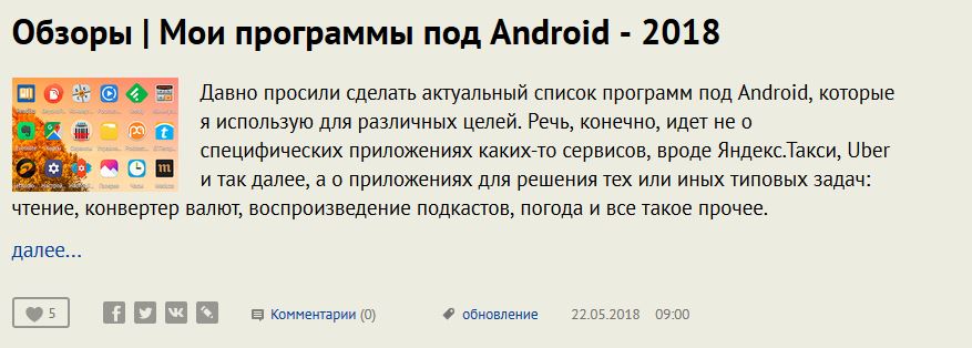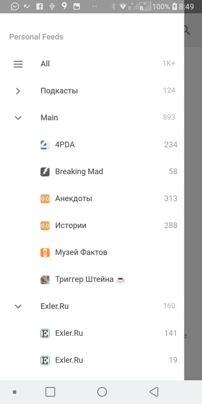 Тут все просто - Feedly. Достаточно простенькое приложение, но мне его вполне хватает. Тем более что оно же используется на десктопе. Кстати, вот этот Main - список того, на что я подписан. Но скажу честно, в анекдоты и истории уже минимум год не заходил. Тем более что они почему-то довольно криво там отображаются.