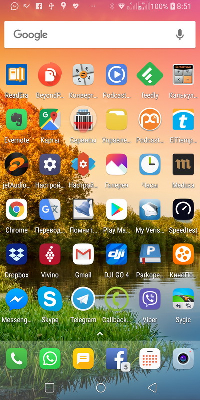 Вот так выглядит мой главный десктоп. Я люблю делать отдельное окно приложений (а не сваливать их все на десктопы), при этом окно приложений вызывается свайпом от нижней док-панели. (При этом не нужно использовать отдельную пиктограмму вызова окна приложений.) Ну и пиктограммы набиваю довольно плотно (здесь это все можно как угодно настраивать), а на главный десктоп ставлю виджет поиска Google - он часто используется.