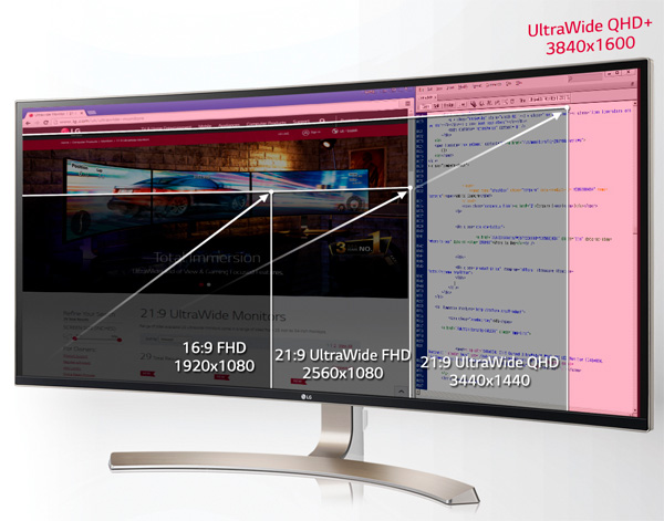 Вот на этой картинке хорошо видно, как увеличивается пространство дисплея при переходе от разрешений FHD к UltraWide FHD, UltraWide QHD (как на моем мониторе) и к UltraWide QHD+.