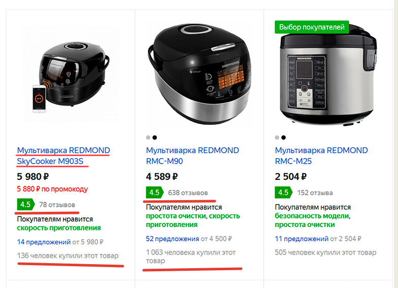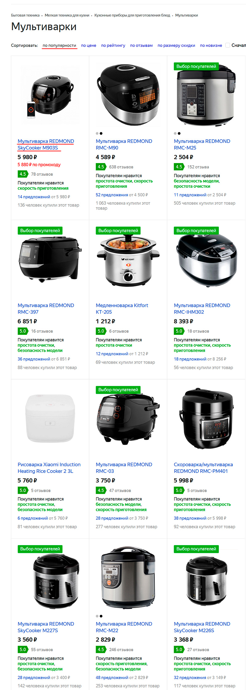 Из двенадцати самых популярных моделей десять - производства компании Redmond, чьи устройства я уже неоднократно обозревал. На первом месте - модель REDMOND SkyCooker M903S. Я посмотрел ее характеристики: эта мультиварка, которая имеет 17 встроенных автоматических программ, использует 3D-нагрев и металлическую чашу с керамическим антипригарным покрытием, позволяет вручную устанавливать свои настройки времени и температуры, поддерживает приготовление блюд по технологии су-вид, ну и, кроме того, ею, как и другими "умными" домашними устройствами Redmond, можно управлять со смартфона, в том числе из любой точки земного шара. Отличный набор функций, не так ли? Да и отзывы на нее на "Яндекс.Маркете" хорошие.