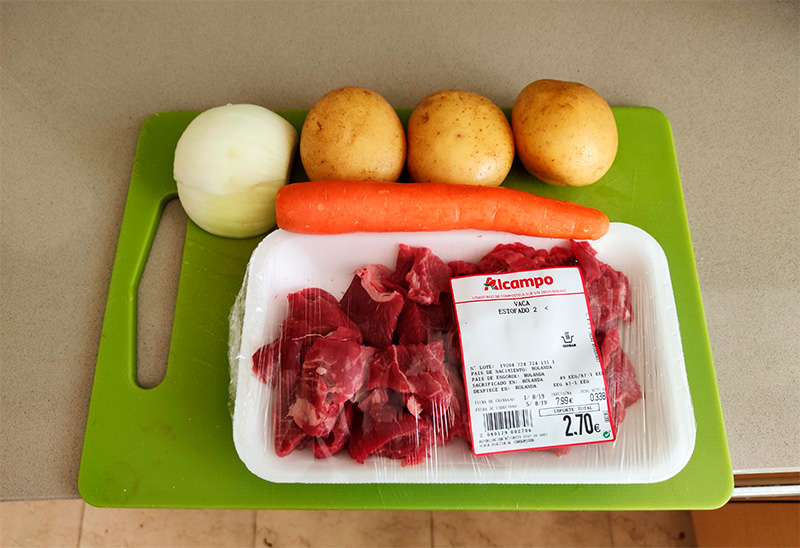 Лук и морковка нарезаются, вместе с кусками говядины высыпаются в чашу. Туда же добавляется немного воды.