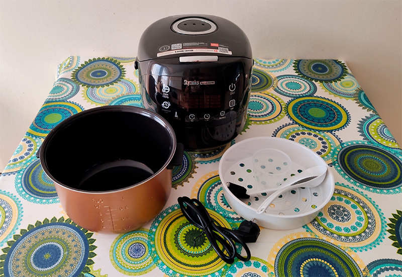 Комплект поставки: мультиварка, чаша, контейнер для приготовления на пару, мерный стакан, черпак, плоская ложка, держатель для черпака/ложки, шнур электропитания, книга рецептов, руководство по эксплуатации, сервисная книжка.