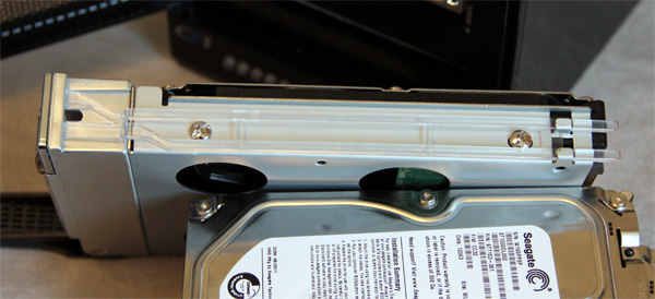 С охлаждением тут все хорошо - благодаря конструкции получается хороший теплоотвод, большой кулер выделяющееся тепло выдувает наружу и охлаждает диски, так что даже под приличной нагрузкой температура дисков - где-то 36-38 градусов.