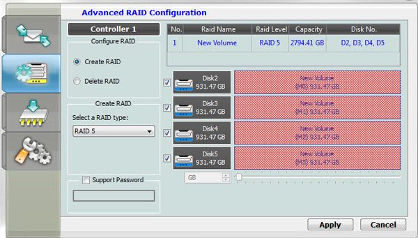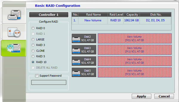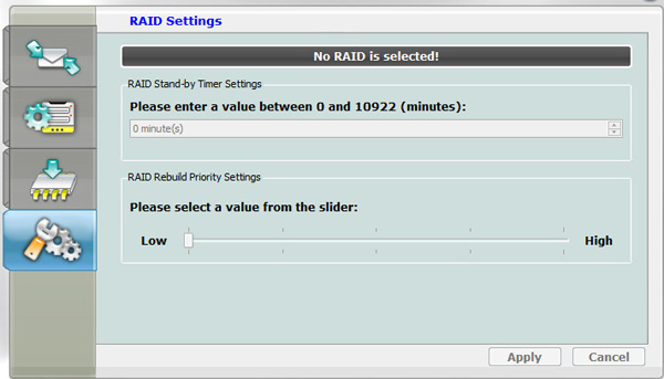 DAS поддерживает режим горячей замены дисков в конфигурациях Clone, RAID 1-3-5-10. То есть вы можете просто на ходу вытащить один диск и вставить вместо него другой. При этом для RAID начнется автоматическое перестроение массива с максимальной скоростью до 200 Гб в час - эта скорость зависит от выставленных настроек. Во время процесса перестроения, конечно, скорость работы массива упадет - примерно вдвое. Если поставить минимальный приоритет перестроения (а по умолчанию именно такой и стоит), то производительность во время перестроения упадет очень незначительно - процентов на 10-15.