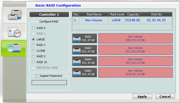 Large (аналог JBOD) - система рассматривает совокупную емкость всех дисков, установленных в DAS, как единое пространство. С одной стороны, это удобно, особенно в случае использования дисков разной емкости, но с другой - надежность такой системы очень низкая: если из строя выходит один диск, информацию с других уже толком не прочитать. Теоретически можно подключать диски по отдельности и пробовать спасать с них информацию, но при этом в любом случае недосчитаетесь очень многих данных, поэтому данный режим обычно стараются не использовать.