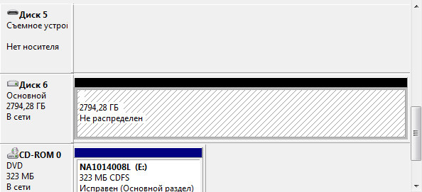 После этого подключаете DAS к компьютеру - в системе появляется новый накопитель (или накопители, если выбран режим Clean). Если диски новые, либо же установлен какой-то режим, отличный от Clean - логический диск в системе не появится, подключенный диск нужно будет сначала инициализировать. Это делается через Пуск - Все программы - Администрирование - Управление компьютером - Управление дисками. Там будет виден новый том.
