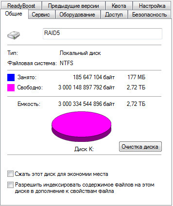Вот, например, мой накопитель в режиме RIAD 5 для 4-х дисков по терабайту.