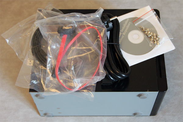 Комплектация: накопитель, кабель питания, кабель USB, кабель eSATA, винты для крепления жестких дисков (20 шт), инструкция по установке.