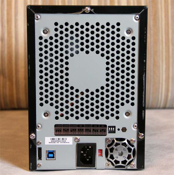 Сзади - выход eSATA, выход USB 3.0 (2.0), гнездо подключения сетевого шнура, переключатель напряжения сети, три переключателя режима работы дисков (о них подробнее - чуть ниже), кнопка Reset, отверстия маленького кулера блока питания и сетка большого 12-сантиметрового кулера, охлаждающего диски.