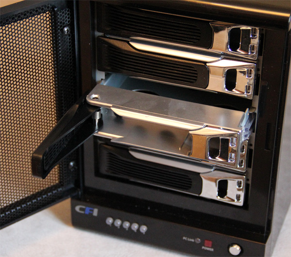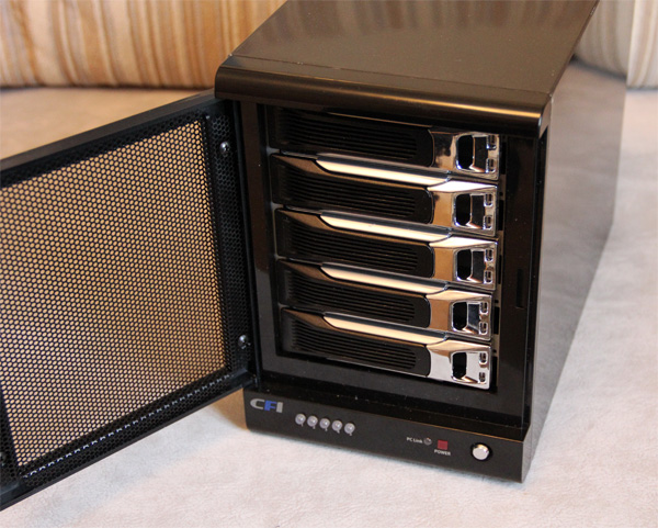 Передняя дверца открывается, под ней скрываются пять фреймов для жестких дисков.
