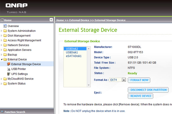 Мой NAS не позволяет использовать подключенные внешние диски в качестве основных хранилищ (и правильно делает), однако их можно подключать как временные хранилища или как хранилища для бекапирования данных.