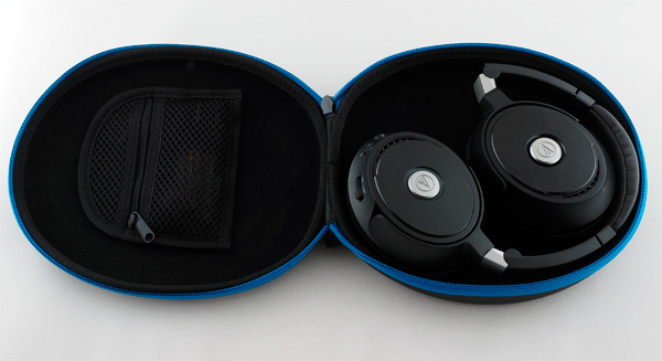 Наушники компактно сложены. На верхней части чехла есть кармашек, в котором можно хранить адаптер, переходник и запасную батарейку.