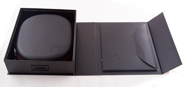 Раскрывается - внутри наушники в кейсе, конверт с инструкцией.