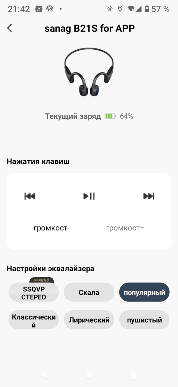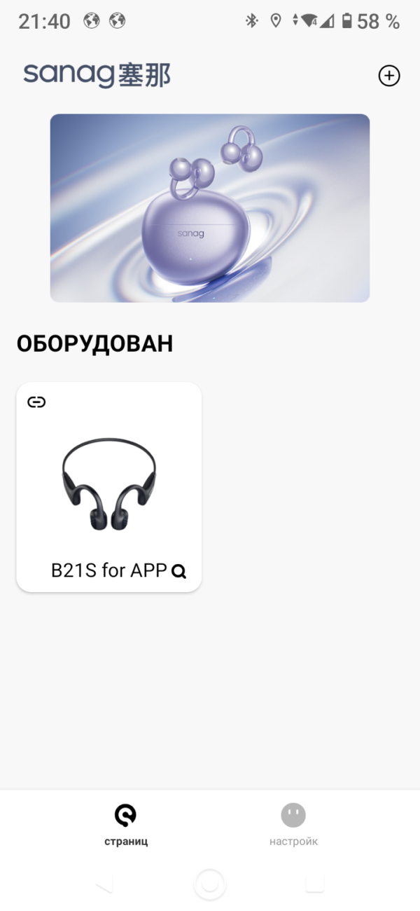 Надо сказать, что прямо с лета подключить наушники у меня не получилось. В режим сопряжения они ввелись длинным нажатием кнопки питания (она же "+") при включении, но в списке доступных для подключения устройств наушники определялись как sanag B21S for APP, и при попытке подключения выдавали сообщение, что подключать их нужно через приложение.