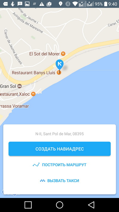 Нажимаем кнопку "Навиадрес". Там можно построить маршрут к указанному месту (через навигаторы Google или "Яндекс"), вызвать такси - эта точка будет передана в соответствующую службу (в данном случае это "Убер", но, скорее всего, службы будут добавляться).