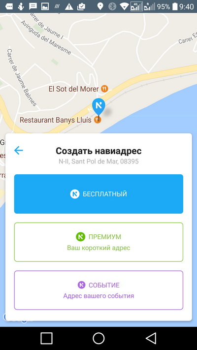 Выбираем "Создать навиадрес". Пункт "Бесплатный" - обычный навиадрес. Пункт "Премиум" - более короткий адрес из кода страны плюс пять цифр (1490 рублей в год) или еще более короткий из кода страны и четырех цифр (14 990 рублей в год). Премиум-адреса могут понадобиться каким-то компаниям, которые захотят получить крутые навиадреса. Ну и "Событие" - это создать событие для данного адреса.