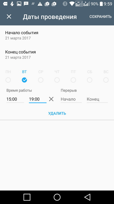 В событии вводятся дата (или даты) проведения и время проведения (событие может быть множественным - например, еженедельные встречи).