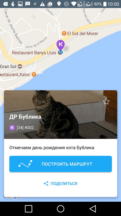 Предположим, мы в этом ресторанчике на пляже хотим провести день рождения кота Бублика. Нажимаем на карточку данного навиадреса, там теперь есть пункт "Добавить событие".