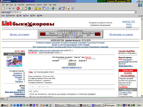 Развлекательный сервер "Быки и Коровы". Содержит порядка пятнадцати основных разделов, каждый из которых обновляется ежедневно, причем некоторые из них - раз в пятнадцать минут. Посещаемость - порядка 15 000 человек в сутки