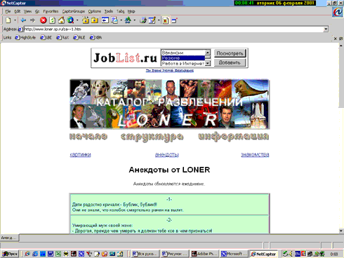 Страница "Лучшие анекдоты на сайте LONER". Несмотря на ежедневное обновление, посещаемость - 50 человек в сутки. Меньше, чем на некоторых обычных домашних страничках. Так что не так уж и просто сделать посещаемый сайт развлечений