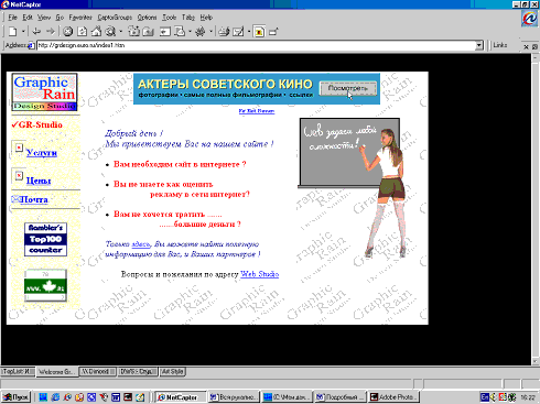 Сайт некой Gr-Studio. Они обещают "выполнить Web-задачи любой сложности". Только с одной задачей они справиться не смогли: сделать хотя бы что-то похожее на дизайн на своем собственном сайте. Потому что этот кошмар, который вы видите на экране, даже Вася Пупкин постеснялся бы назвать своей домашней страницей