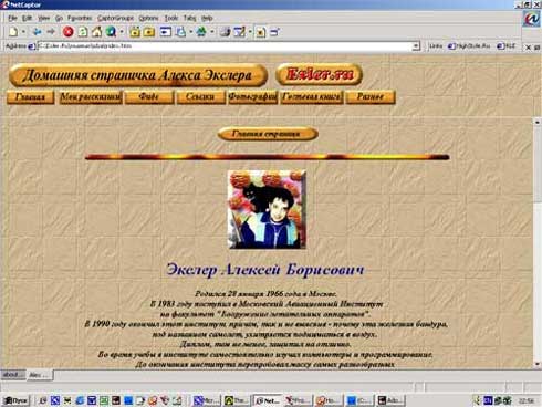 Летом 1998 года я решил, что моя домашняя страница должна представлять собой чудо дизайна (подобные мысли хотя бы раз в жизни появляются у любого владельца домашней странички), после чего вооружился каким-то пакетом со стандартными наборами всяких картинок для веб-дизайна, в результате чего на свет появилась невероятно кошмарная домашняя страничка Алекса Экслера, которую я сваял собственными руками и еще этим гордился. Вот это чудо природы: