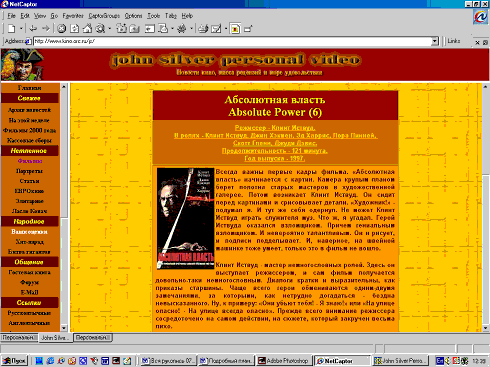 2) Фреймовая структура обладает намного меньшей универсальностью, что отражается на просмотре сайта в разных броузерах. Нередко бывает так, что в MSIE меню во фрейме смотрится нормально, а при просмотре в Netscape часть текста съедается границей фрейма. Вот один из примеров с того же сайта "John Silver Personal Video":