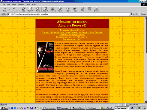 Когда мы заходим на раздел рецензий сайта "John Silver Personal Video" (http://www.kino.orc.ru/js) через меню левого фрейма, то получаем рецензию на фильм так, как ее планировал показать создатель сайта. Если же мы запомним прямую ссылку на данную рецензию (http://www.kino.orc.ru/js/review/absolute_power.htm) и попытаемся вызвать сразу ее, то получим только эту рецензию без заголовка и меню, поэтому далее по сайту никуда двинуться не сможем. Сайт в данном случае будет выглядеть так: