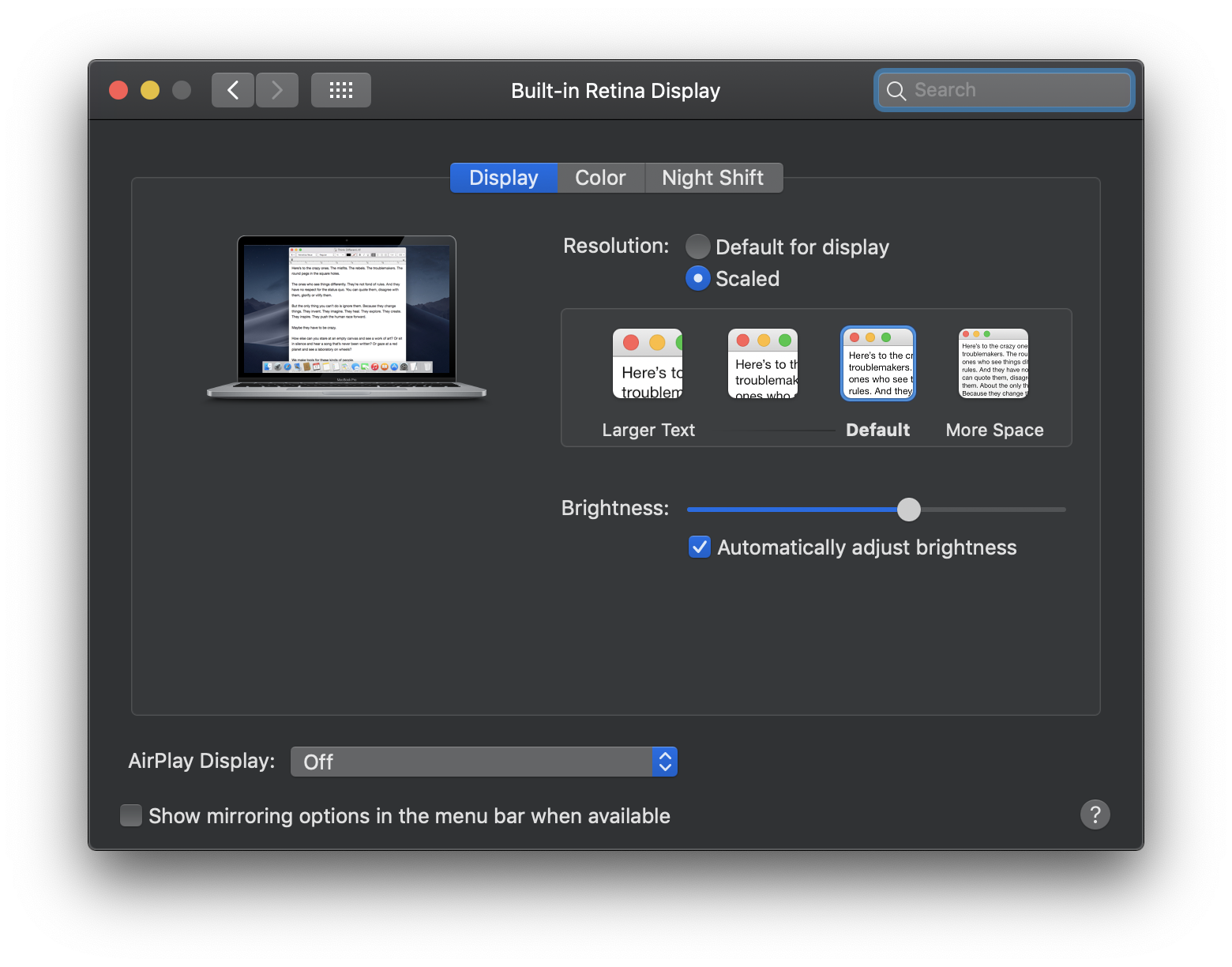 Я понимаю еще, если бы можно было сделать, как на MacBook с Retina Display. Там физическое разрешение матрицы - 2560×1800. Но вы не можете выставить такое разрешение в операционке. Максимум - 1680×1050, а по умолчанию вроде и вовсе выставляются традиционные 1440×900. И это, в общем-то, правильно: перед масштабированием изображения операционка отрисовывает его с вчетверо большим разрешением, а потом укладывает в нужное. Поэтому картинка получается невероятно четкая, резкая и контрастная, разница с другими дисплеями заметна очень сильно.