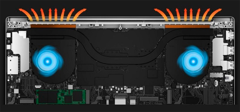 При этом ноутбук нагревается очень несильно, а кулеры включаются при достижении температуры в 54 °C, то есть только на очень тяжелых приложениях. При обычной работе их не будет слышно вообще, а на тяжелых приложениях они будут шуметь значительно тише.