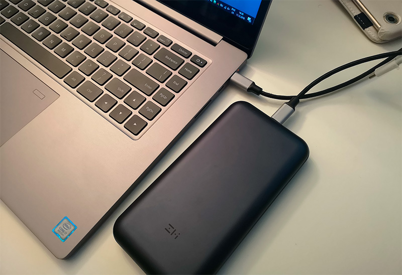 И вот тут-то я порадовался тому, что в свое время купил крутой аккумулятор Xiaomi ZMI 10. Потому что он поддерживает USB Power Delivery и прекрасно заряжает данный ноутбук. В ноутбуке батарея - 60 Вт·ч, у ZMI 10 емкость - 72 Вт·ч. Рассчитывал, что зарядит с нуля где-то до 85% (там же потери всякие идут при зарядке). Но зарядил до 92% за два часа. Круто! Так что трансатлантические перелеты мне теперь не страшны!